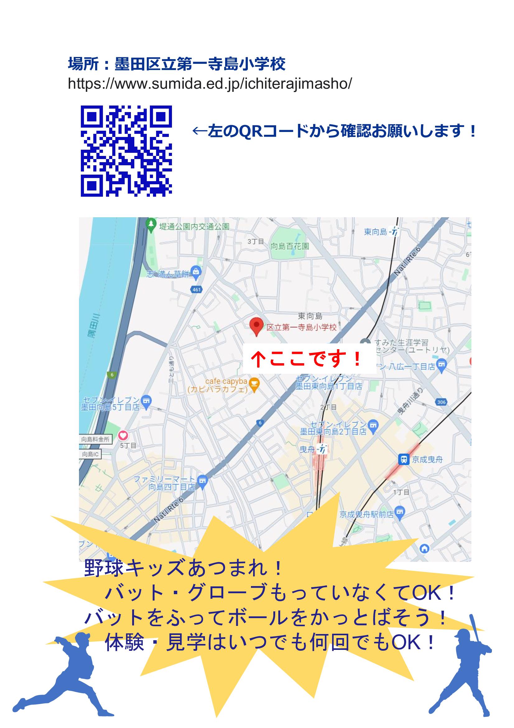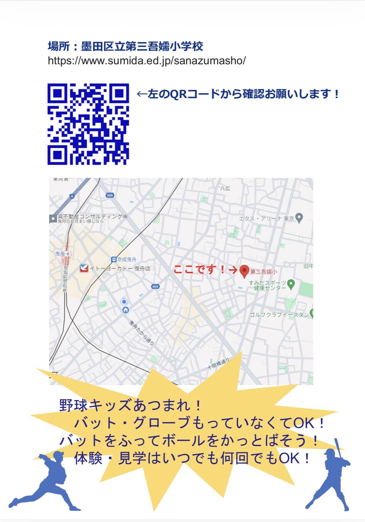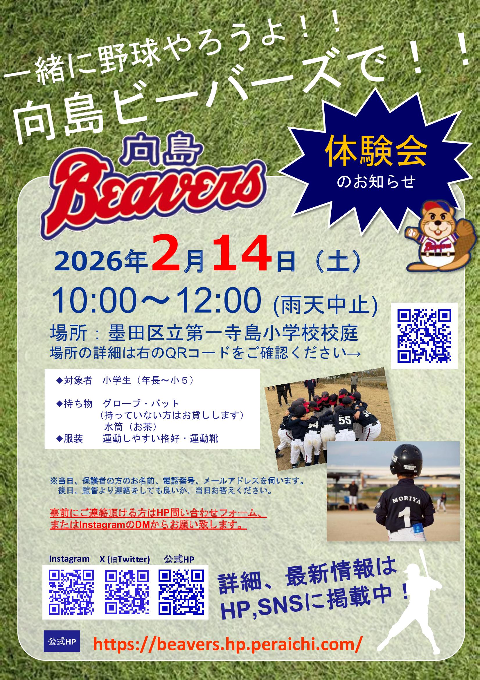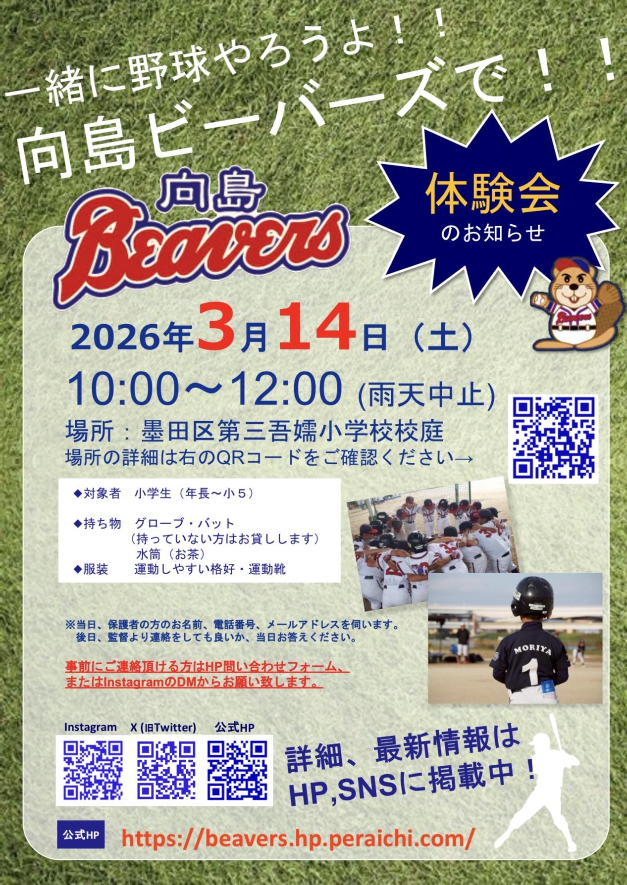 ⚾️2月・3月野球体験会⚾️ 体験会の開催日のお知らせです! 🔹日時:2026年2月14日土曜日 10:00〜12:00 場所:墨田区立第一寺島小学校 🔹日時:2026年3月14日土曜日 10:00〜12:00 場所:墨田区立第三吾嬬小学校 ※詳しい場所は画像2枚目のQRコードよりご確認下さい✨ ◯対象者:年長~5年生(幼稚園・保育園のお友達も大歓迎) ◯持ち物:グローブ、バット(無ければ貸し出しします)、水筒 ◯服装:運動しやすい格好、運動靴 特に3年生、2年生、1年生、年長さん、大募集中! もちろん他の学年のみなさんの参加も大歓迎です⚾ 練習の見学だけでもOKです。 お問い合わせは「見学・体験申込」まで😃 |